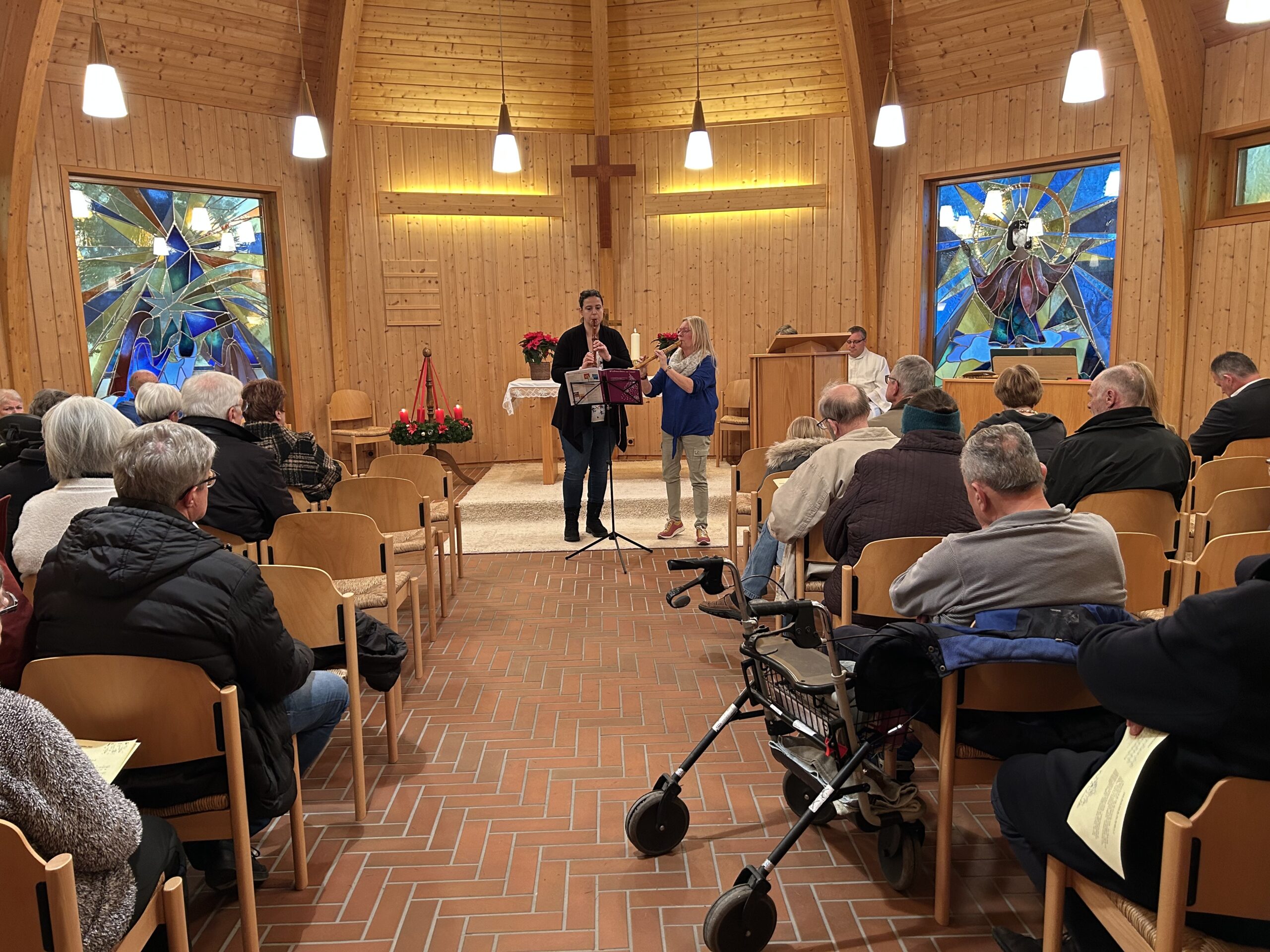 Die gemütliche Stimmung wird gegen 15:30 Uhr in unsere Christus Kapelle verlegt. Dort findet der alljährliche ökumenische Adventsgottesdienst mit Pfarrerin Nolte und dem Ge-meindereferent Harstick statt. Ganz im Zeichen der Freude wird der Gottesdienst von einem Flötenduo um Frau Schäfer und Frau Sevin abgerundet. Neben Liedern wie „Macht hoch die Tür” und „Es kommt ein Schiff geladen” kann man sich langsam auf die weihnachtlichen Lieder einstimmen, welche in den nächsten Tagen rund um den Weihnachtsbaum gesungen werden.